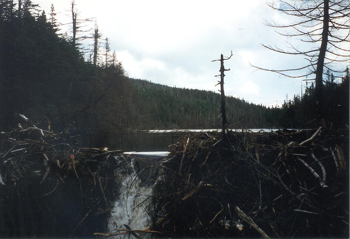 Somehow the storm passed us by without any rain. Here is a beaver dam at the outlet of Lake Tear of the Clouds. |