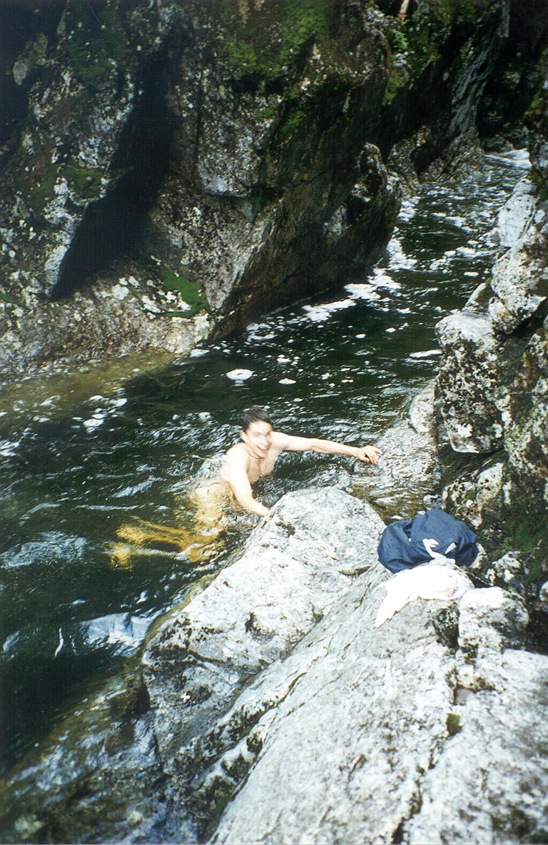 Joe decides to take a swim in the very cold water of the Opalescent river |