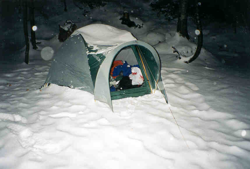 The snow makes for pretty hiking. Setting up camp was a trick. Snapped a tent pole. |