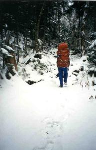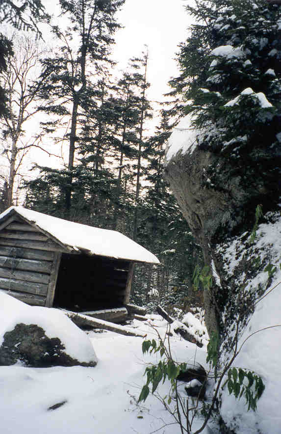 The next morning, the stove worked OK so I packed up a few quarts of boiling water, my gear and set out. This is slant rock lean-to. |