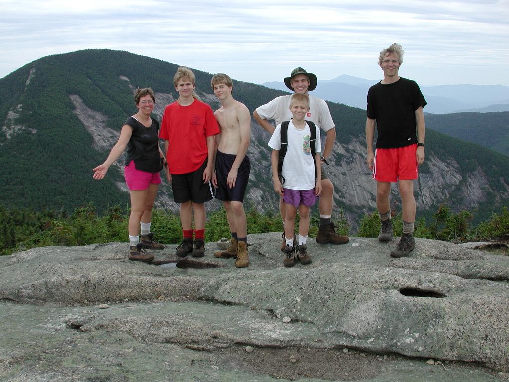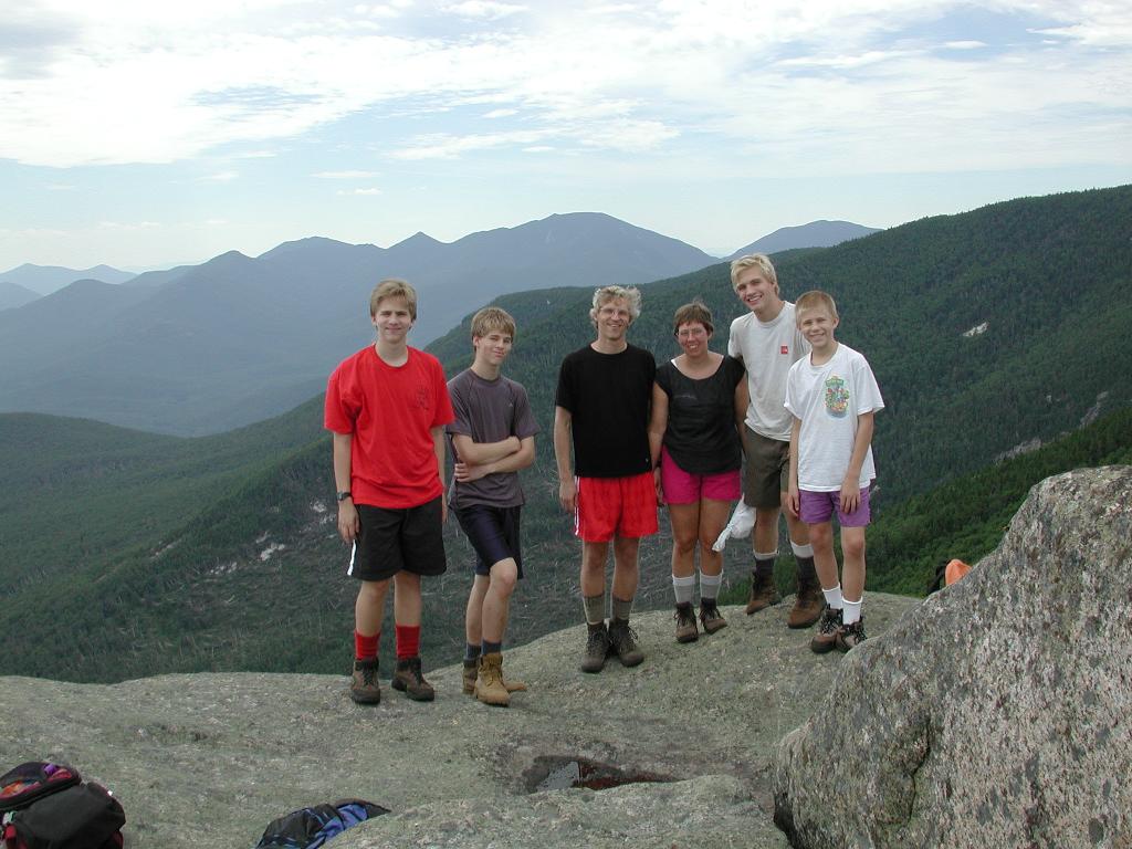 family in front of blowdown on the mountainside below; the Dix range is in the distance |
