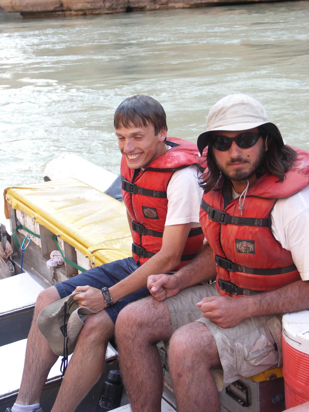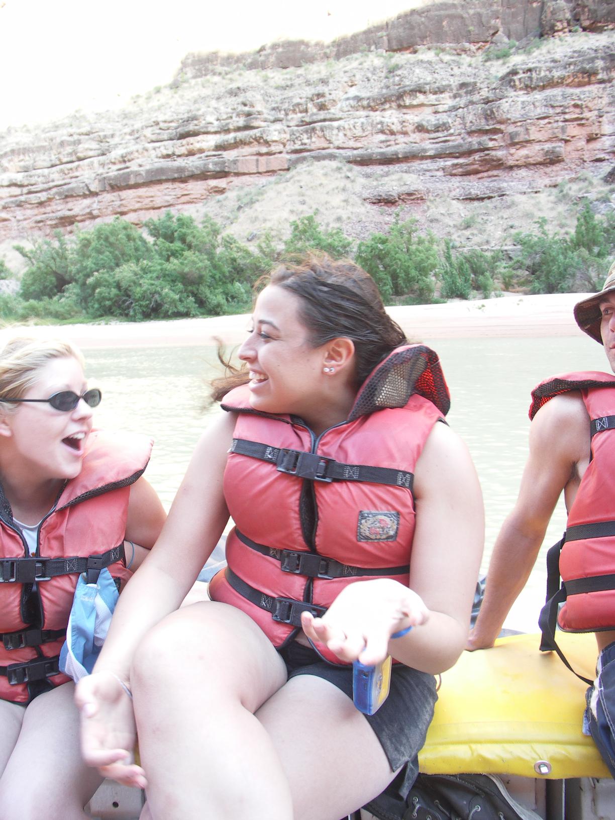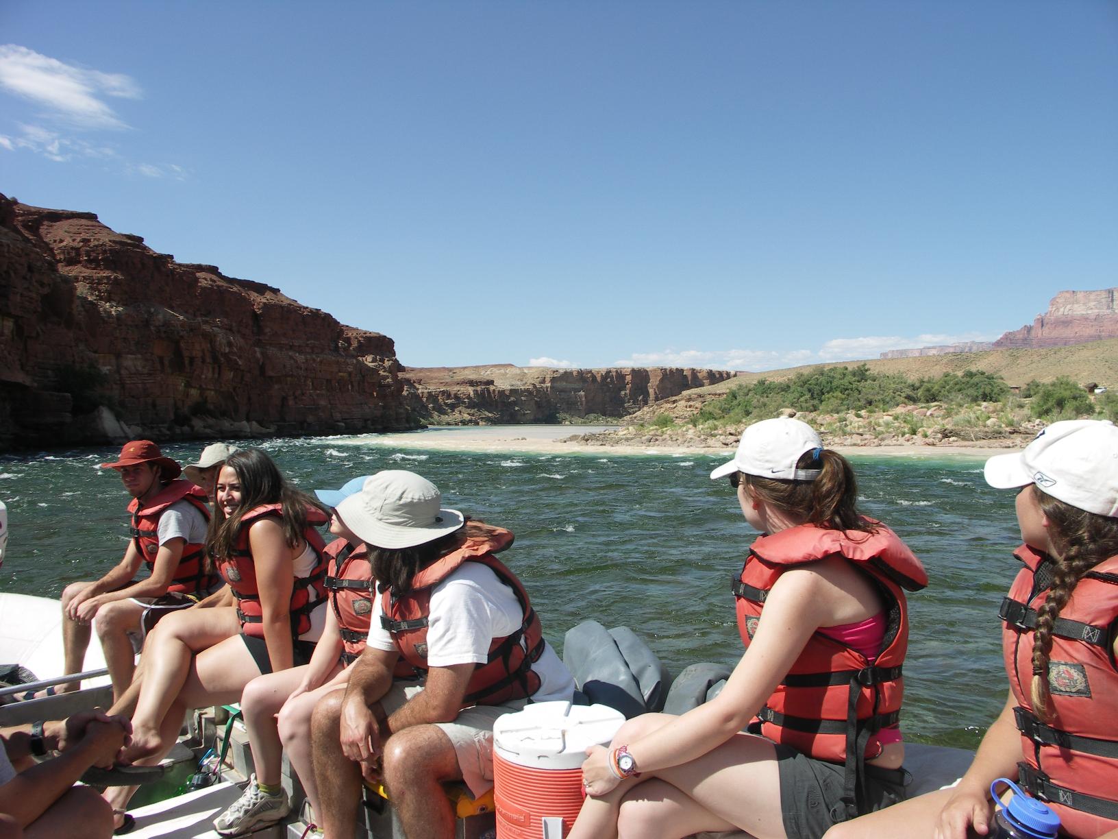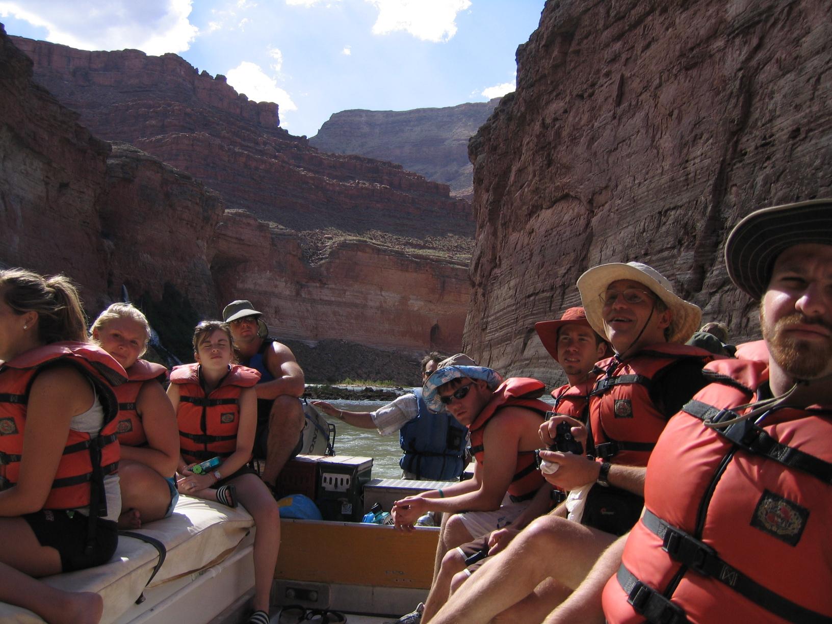we fill a raft, 20 of us and three guides; the pilot takes us across clear water |
