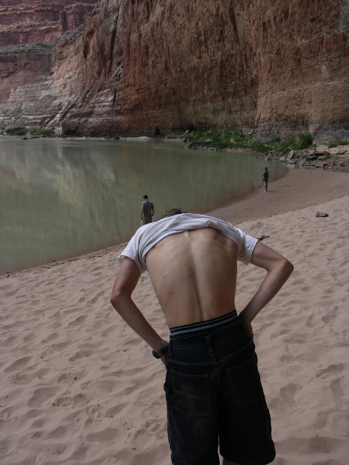 a student was diagnosed with "possible chicken pox"; after much consulting with doctors and others, he was allowed on the trip; here he shows his pox |